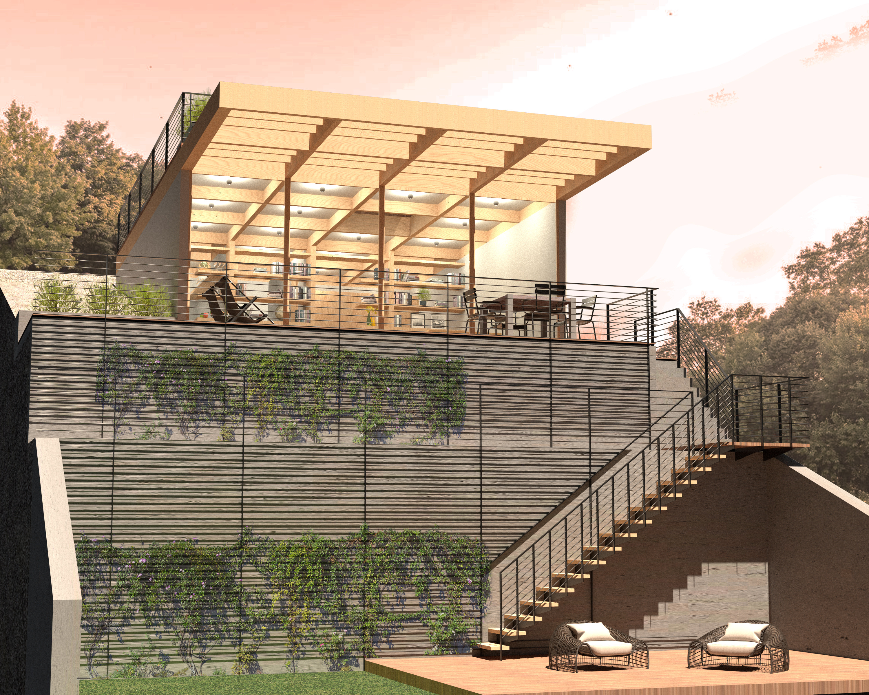 One client is a corporate consultant, the other an artist, both of whom found themselves working from home during the pandemic with a young child. The project has two parts: the renovation of the master bathroom to provide a spa-like atmosphere, and a detached ADU that serves as an office, yoga studio, and residence for visiting relatives. Situated on the top edge of a steep, up-slope lot, the ADU was designed to minimize required retaining structures and also take advantage of the views beyond. Light comes from four large skylights and a fully operable facade, and a large roof deck provides a private outdoor space for relaxing and entertaining. The structure of the roof is expressed on the ceiling, with large coffers allowing for a simple and elegant grid of lighting and visual disruption to the otherwise simple box.