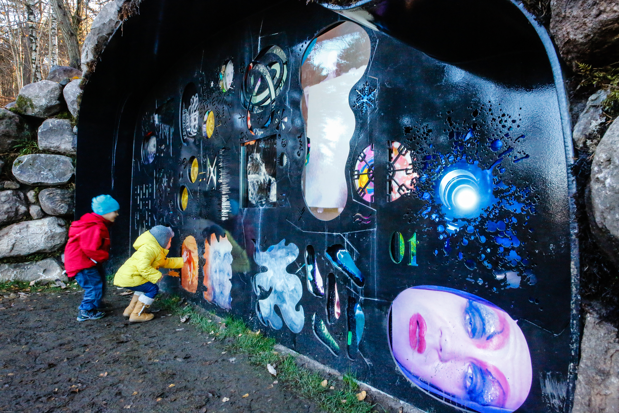 Inspired by the history of Nordic telecommunications and specifically by the pre-historic ruins at the Ekebergparken site in Oslo, Norway, Klang erupts vertically from the ground to the stars in an imaginary arch connecting to three other elements in the park produced by Oursler, to form a high-tech son et lumiere. The artist stated, "Visually we travel through the performative human formation of runes to the geometric optical telegraph, continuing on with cellular technology and the ever present information cloud represented by the projections into the trees." Inside this cavern covered with local vegetation, complex video images are embedded and silhouetted through blackened steel apertures. The trace of human mark making can be found here, revealing early coalescence of language. Images glow in layered iconic loops, in gestures, signs, diagrams, formulas, and inscriptions. Performers of all ages interact with symbols and a variety of signals, metaphorically moving language from the hand to mouth and finally to telecommunications. The frenetic pictorial plane appears ever-changing, interacting not only internally but also with the natural surroundings of its permanent home, the woods of Ekeberg, rich with plant and animal life, human heritage, and omniscient history.